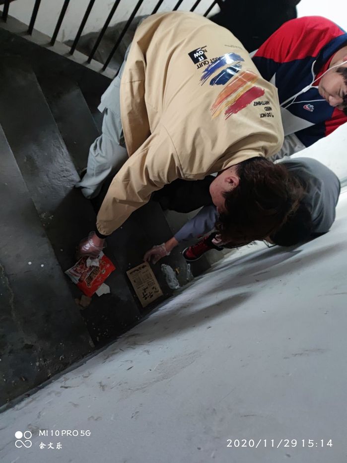 本次活动打扫的地点是5、6、21、22、27、28六栋学生宿舍楼楼梯和过道。29日下午3点同学们在27栋宿舍楼下准时集合,大家在各自分配到的卫生区域开始打扫卫生,相互配合。一个同学带着手套拾捡垃圾,另一个就拿着垃圾袋承装垃圾。同学们都在互帮互助中感受集体的力量。在凛冽的寒风中大家清扫认真,良好的精神风貌为寒冷的冬天增添了一份温暖。