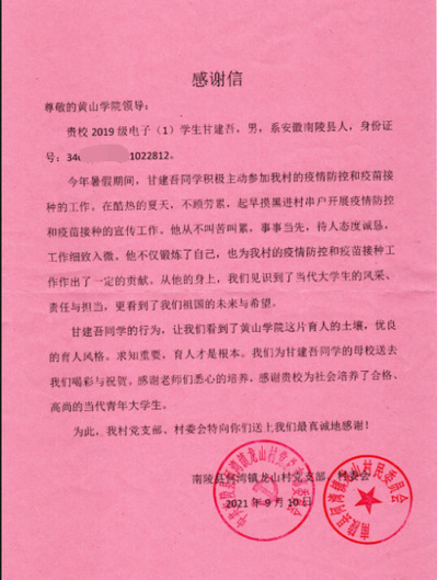 近日,我院收到来自安徽南陵县何湾镇党组织发来的感谢信,信中对我院学子甘建吾提出表扬,并对我校培养出有家国情怀的优秀学子表示感谢。