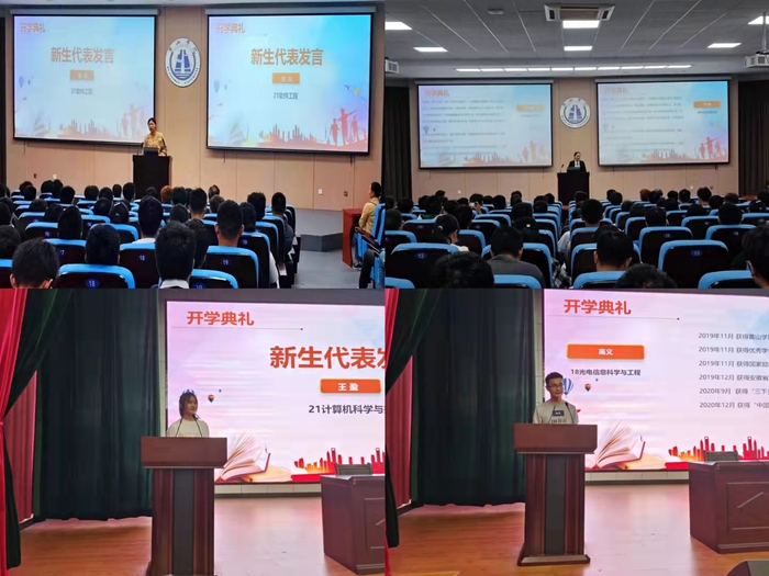 电子信息工程专业教师宁仁霞副教授代表全体教师作了表态发言,对同学们的到来表示欢迎,并提出建议和期盼。老生代表高义、新生代表王盈、董淼在典礼上作了发言。