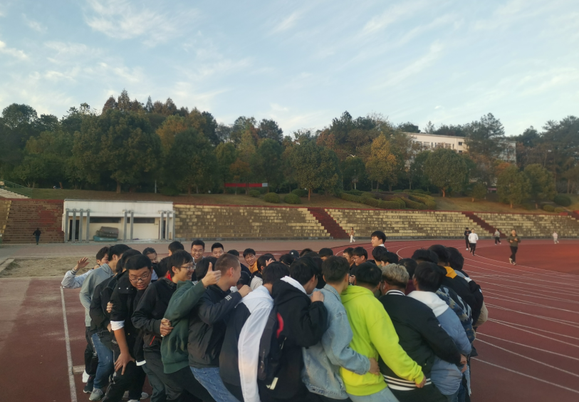 首先,辅导员胡小侠带领我们在操场集合,让我们四个人一组,玩四人五足的游戏,看哪个队伍跑完规定路程且时间最短,同学们争先恐后的表现自己,同学们玩的不亦乐乎。第二个游戏万里长城永不倒,我们男生围成一个圈,女生在里面也围成一个小圈,然后同学之间互相坐在另外一个同学的大腿上面,依次坐了起来,坚持10秒。这个游戏让同学们建立了互相信任和团结。第三个游戏是剪刀石头布。这个游戏让我们更加有凝聚力,更加了解彼此。第四个游戏是手写你最困扰的三件事。