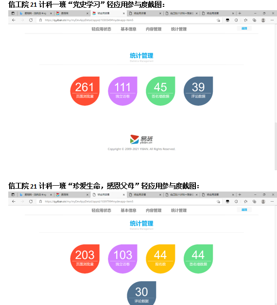 基于前期学校易班发展中心开展的“不忘初心使命,坚守安全底线”主题易班网络文化活动为契机,通过各班级开展丰富多彩,形式多样的党史学习教育。各个班级开展安全主题教育、党史学习教育等轻应用,以及易瞄瞄和微社区等活动的参与度和完成度作为评选标准。