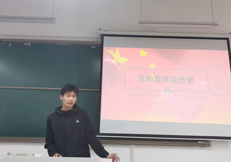 2022年4月19日,在文端2407教室由团支书张登凌同学带领21光信息班的同学们开展党的青年运动史主题团日活动。