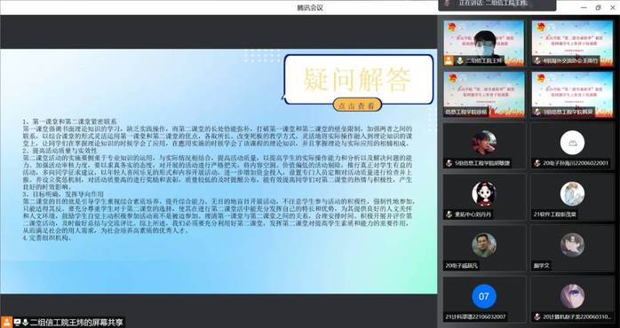 本次活动主要通过线上腾讯会议的方式对同学们进行有关第二课堂的培训,培训内容涵盖如下几个方面:1.什么是“第二课堂”,“第二课堂”包含哪些方面,在人才培养方面又有何优势;2.我校“第二课堂”承载平台——到梦空间APP学生端日常功能使用讲解;3.结合学院“第二课堂”发展现状,提出问题,并尝试找到解决方法。