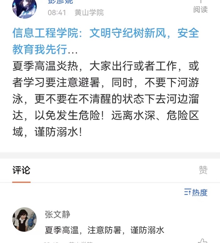 本次安全主题活动,由两部分构成:安全主题教育学习和话题讨论。永利yl23411集团的同学们积极参与,观看相关关的暑期防疫、防诈骗、防溺水和用电安全等相关短视频教育并在易班平台进行话题讨论。同时,还积极在易瞄瞄平台上发布相关安全话题与评论点赞。同学们踊跃参与,极大的提高了同学们的安全防范意识。