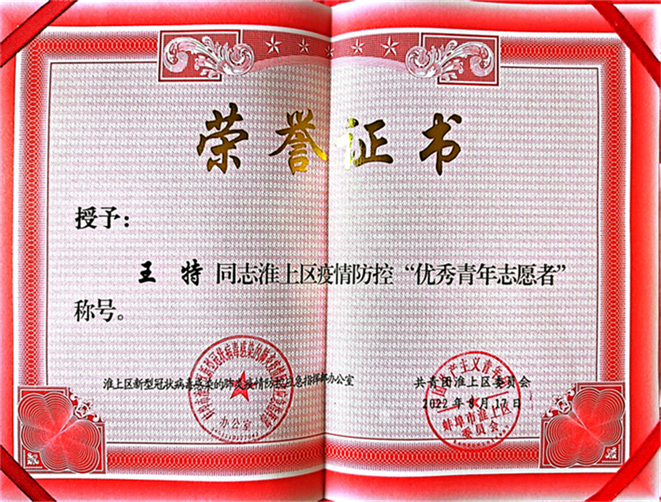 暑假期间,王特积极参与家乡疫情防控,完成核酸检测、信息录入等工作。该同学作为一名大学生团员,能够在家乡疫情防控的关键时刻挺身而出,用实际行动展现了新时代共青团员的情怀与追求。