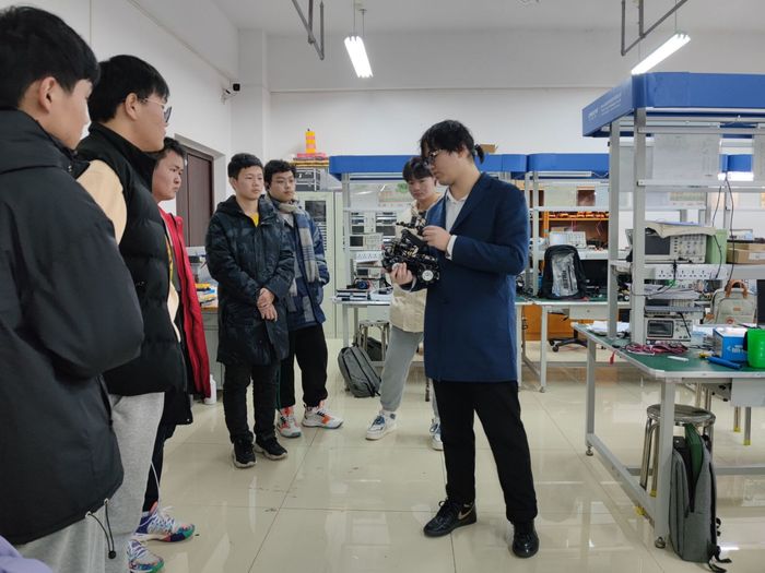 在实验室参观环节中,同学们有秩序地参观了机器人实验室、电子实验室等,机器人实验室的负责人向大家展示了机器人的运行状态和原理,并且让同学们和机器人进行了亲切友好的互动。同学们对实验室的环境及负责人展示出的电子工艺作品表现出浓厚的兴趣,积极地动手实践。