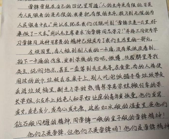 同学们热情高涨,通过文字分享的形式表达了各自对雷锋精神的感悟与理解,主办方收到的稿件形式多种多样,文章内容质量上佳。有些征文以阐述雷锋精神的深刻内涵为主要内容,有些征文以在平凡事迹中发掘雷锋精神为主要内容。本次比赛最终评选出一等奖1名、二等奖2名、三等奖3名。