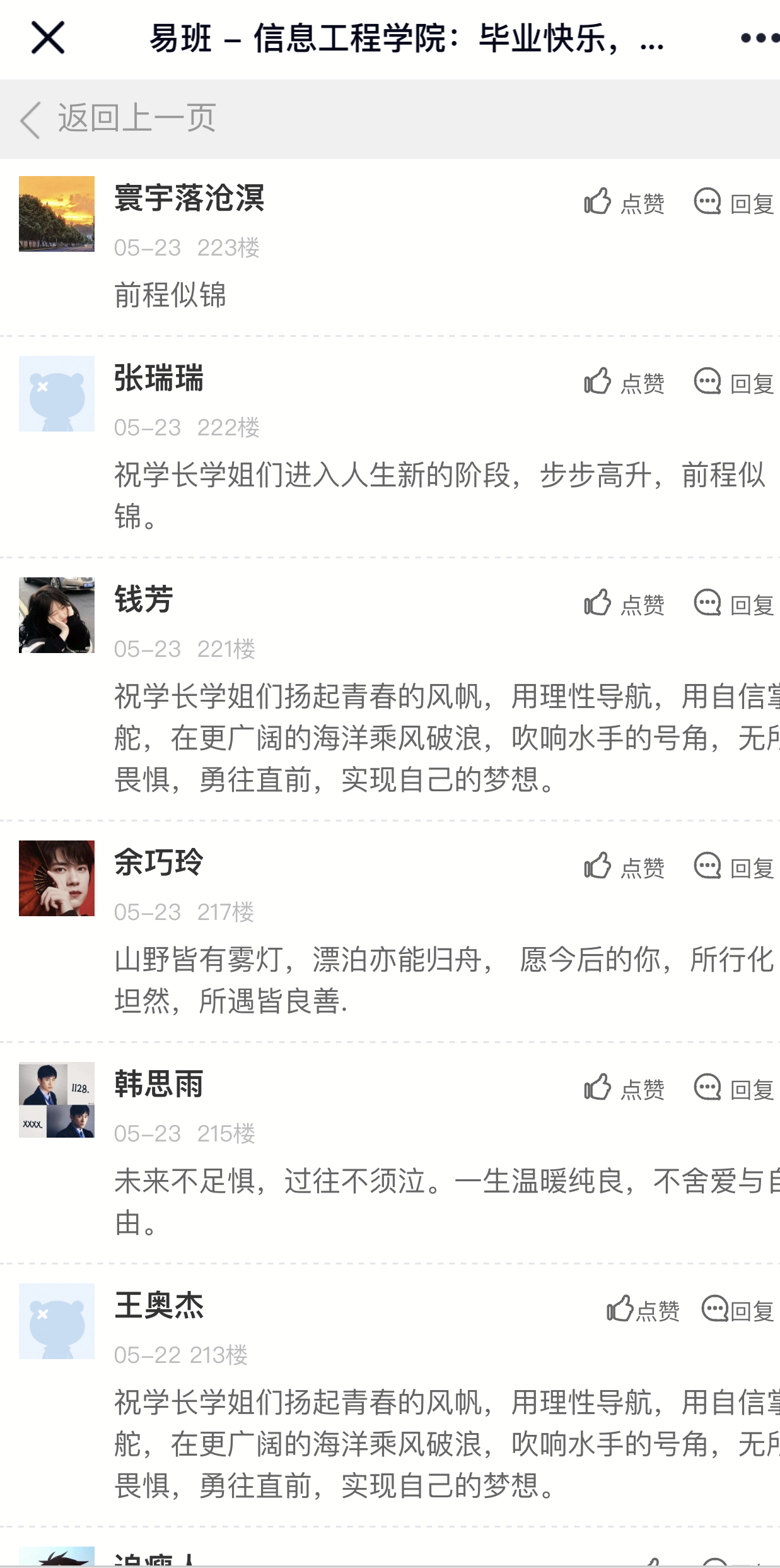 在活动中参与者通过在易班APP轻应用中“惜取此时心”模块的评论区发表对学长学姐们的祝福或学校里的美丽风景。校园时光是人生中最美好的时刻,每到毕业季,同学们都对校园生活的留恋与不舍。荀子说:“赠人以言,重于金石珠玉”。祝福就像是一座光芒四射的灯塔,可以给人们指明前进的方向,表达最真挚的情感。
