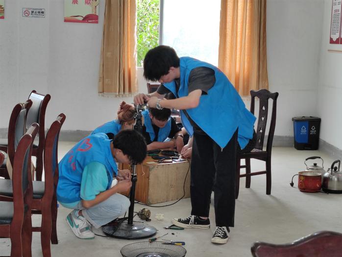 本次“三下乡”活动期间,志愿者们来到定潭村、绵潭村、防里村、九砂村、淮源村、大茂社区等多个村庄,在村干部的帮助下在村里展开了广泛的宣传。通过积极宣传和村民们的相互转告,带着电器前来维修的村民们络绎不绝。志愿者们合理分工,有条不紊地开展故障查询、维修保养、家电清洗等工作。七天时间里,志愿者们为居民免费维修电风扇、电饭煲和电热水壶等多种家用电器,累计三百余件。