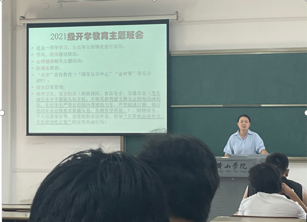 首先,柳老师先对过去一年的学习,生活方面进行总结,讲了各班的学习考试问题,对每个专业的学习情况进行了系统的分析与总结,鼓励同学们新学期脚踏实地,认真对待学习。其次,柳老师还讲了学风班风的建设情况,针对每个班都提出了一些建议,对于心理健康方面,柳老师向同学们传达了心理健康方面的知识,提供了一些解决心理困惑的方法,也欢迎同学们有心理健康方面的问题可以找她交流,找信任的朋友交流,找大学生心理健康中心的老师帮助等等,之后,柳老师还对同学们进行防溺水教育以及“反诈”宣传教育,时刻提醒我们要注意人身安全。最后,柳老师讲了宿舍的日常管理以及秋季卫生,安全防范的问题。柳老师倡导为了维持良好的宿舍关系,不做下列五类人群:不承担宿舍责任;无视他人存在,我行我素;随意泄露室友隐私;把室友的代劳当做理所当然;未经许可乱用别人的东西。柳老师说在同一个宿舍里,作为宿舍的一员,有责任承担自己的义务,安排给自己的卫生任务要完成,尊重同宿舍的同学,不要太自我,不可随意泄露室友隐私,要心怀感恩之心。然后柳老师通过举例的方式让我们注意疾病预防、食品安全、交通安全和财务安全等问题,倡导“不在教室吃零食,不在宿舍吃正餐”的文明养成行为。