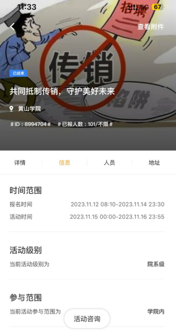 本次活动主要通过到梦空间发布通知,然后大家按照要求加入防范传销主题的易班优课课群,学习相关内容并参与反传销线上答题。同时,还创建以“防范传销”为主题的易班轻应用,组织大家积极参与其中。提高同学们防范传销的意识,构建更加安全的校园环境。