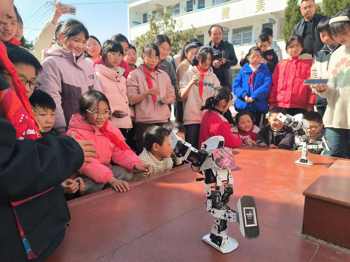 在学校篮球场上,伴随着音乐节奏,人型机器人整齐地跳起街舞,做出各种让人惊叹的动作。孩子们在志愿者的引导下参与其中,在“玩”的过程中自由、快乐地学习、探索,零距离感受现代科技的魅力。