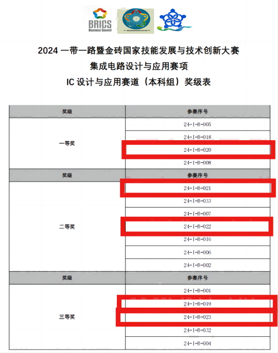 6月1日,2024一带一路暨金砖国家技能发展与技术创新大赛(以下简称“金砖大赛”)之集成电路设计与应用(IC设计与应用、FPGA设计与应用)赛项皖赣区域赛在安徽大学举行,我院学子荣获一等奖1项、二等奖2项、三等奖2项。