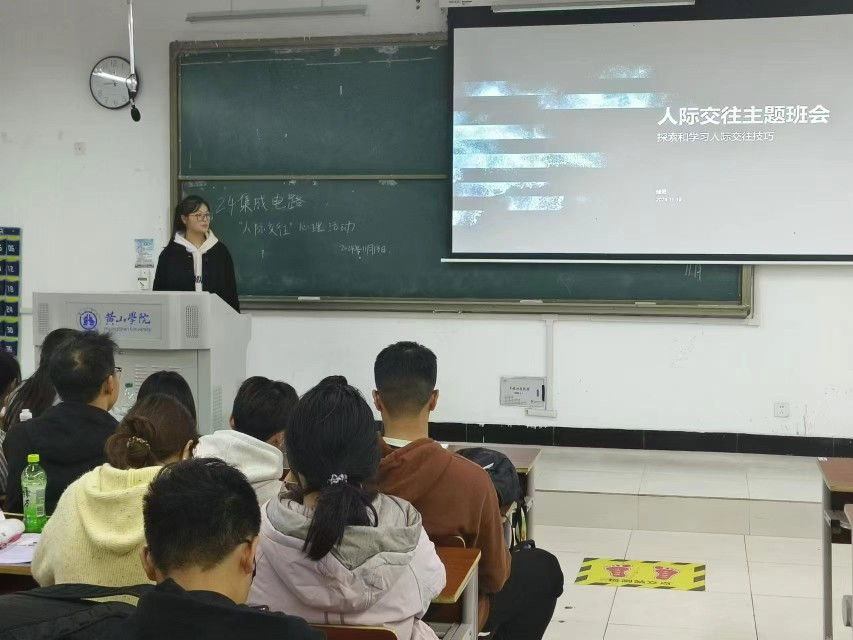 11月19号晚上在文端楼2209,24集成电路班开展人际交往为主题的心理活动,宣讲人心理委员储艳,24集成全体参加。
