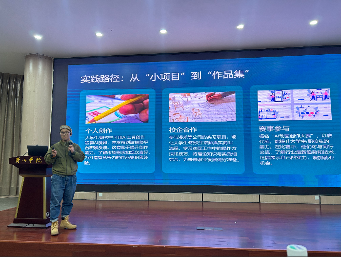 杭州漫禾动漫有限公司合伙人、副总经理胡斌帅作“AI 已来,如何成为风口上的黄金打工人”报告,他围绕 AI 漫剧爆发式增长的行业风口,拆解核心岗位能力,给出大学生竞争力打造路径与行业长期发展趋势。让听众明晰 AI 漫剧行业机遇与岗位需求,掌握“传统功底 + AI工具 + 行业认知”的提升方向,助力把握行业红利,实现职业发展。