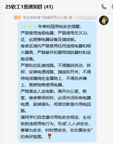 近日,25级软件工程、光信息科学与技术、集成电路设计与集成系统专业学生,携手23级软件工程专业学生,共同开展冬季安全宣传活动。活动通过班会、线上宣传等方式,普及消防、用电、出行等安全知识。同学们积极互动,反响热烈。此次活动增强了大家的安全意识,为营造安全校园环境贡献了青春力量。