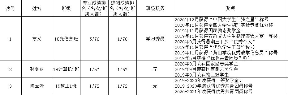 根据安徽省教育厅《安徽省教育厅关于做好2021-2022学年学生资助工作的通知》(皖教秘〔2021〕324号)、《yl23411集团国家奖学金管理办法》(校学〔2020〕8号)要求,进行永利yl23411集团国家奖学金评审,拟推荐高义、孙冬冬、陈云泽三位同学为2021年国家奖学金获得者。现公示如下: