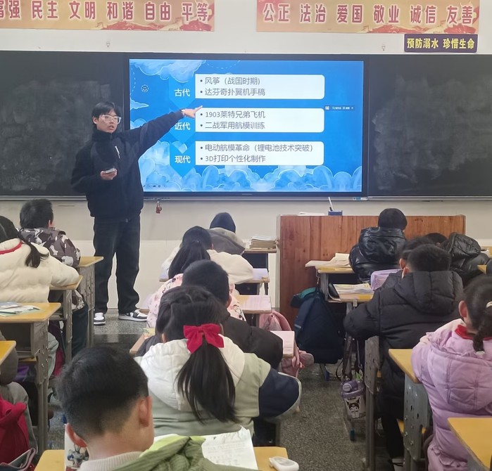 志愿者们携带航模、机器人等前往东城实验小学,开展“科普进校园”活动,为小学生们带来别开生面的航模课程和机器人课程。